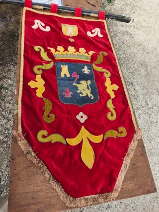 Estandarte antiguo con un diseño heráldico central. - Tela de terciopelo rojo. - Bordados dorados y azules. - Flecos en la parte inferior.