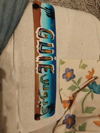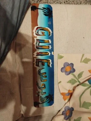 Placa decorativa con diseño playero y palmeras. - Letras pintadas a mano con efecto tridimensional. - Tonos azules, marrones y blancos. - Ideal para decorar cualquier espacio.