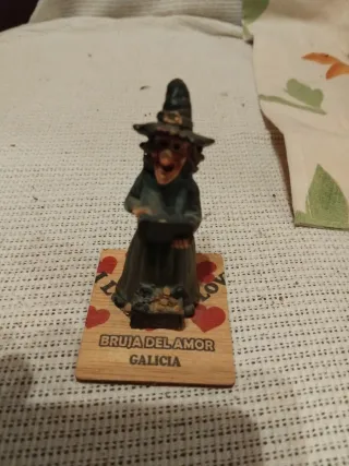 Figura decorativa de una bruja con un sombrero puntiagudo y un vestido largo. La base de la figura tiene grabados. - Bruja del Amor Galicia grabado en la base. - Diseño con corazones rojos y monedas.