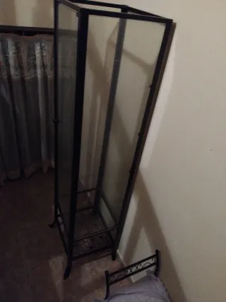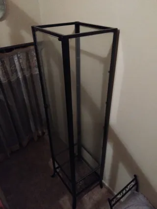Elegante vitrina con estructura de metal negro y paneles de cristal. - Diseño alto y estilizado. - Ideal para exhibir objetos decorativos o colecciones.