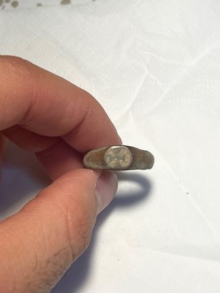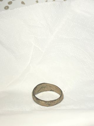 Anillo antiguo de bronce, con un diseño clásico y sin limpiar. Conserva su pátina original. - Material: Bronce. - Estado: Sin limpiar.
