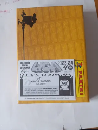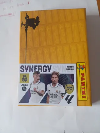 Cromo de la colección Panini Adrenalyn XL de LaLiga. - Presenta a los jugadores Toni Kroos y Luka Modrić. - Incluye el escudo del Real Madrid y el logo de LaLiga. - Diseño con detalles gráficos y el número 4.