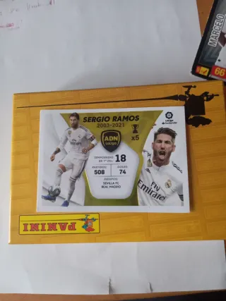 Cromo de Sergio Ramos de la colección ADN LaLiga. - Temporadas: 2003-2021. - Partidos: 508. - Goles: 74. - Equipos: Sevilla FC, Real Madrid.