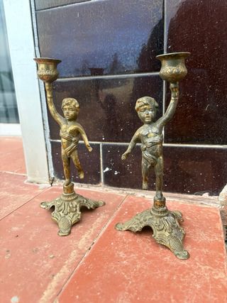 Conjunto de dos candelabros antiguos con figuras de querubines. - Diseño clásico y detallado. - Base ornamentada. precio por la pareja
