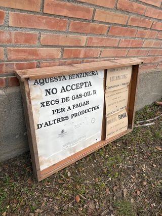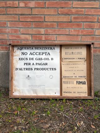 Vitrina antigua de gasolinera con carteles informativos. - Cartel Aquesta benzinera no accepta xecs de gas-oil B per a pagar d'altres productes. - Cartel Existe un libro de reclamaciones a disposición del público. - Cartel Prohibido fumar en el recinto de esta estación de servicio. - Marco de madera.