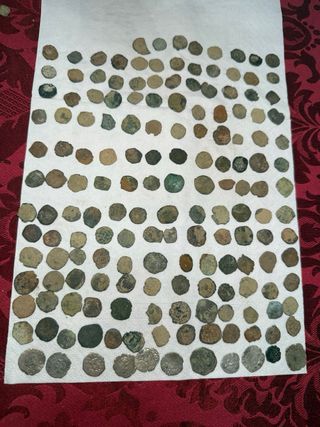 Lote de 164 monedas antiguas de diferentes épocas y orígenes. Algunas presentan detalles visibles en su diseño. - Cantidad: 164 unidades. - Materiales variados. - Diseños diversos.