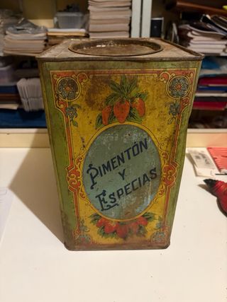Antigua lata de hojalata para pimentón de la marca Pascual Moreno Guerra. - Diseño vintage con ilustración. - Texto Piment y Specias y La Mancha. - Fabricada en Molina de Segura.