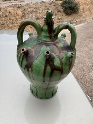 Botijo antiguo de engaño con un diseño único y llamativo. - Color verde con detalles marrones. - Múltiples picos. - Forma de animal en la parte superior.