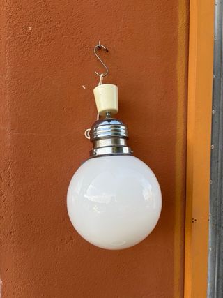 Lámpara colgante con un diseño retro que evoca la década de los 60. Su forma esférica y acabado la convierten en una pieza decorativa única. - Forma de bombilla. - Esfera de cristal opalino. - Base metálica cromada.