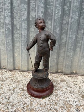 Antigua escultura de calamina que representa a un niño con un bastón. La figura está montada sobre una base decorativa. - Material: Calamina - Base de madera oscura