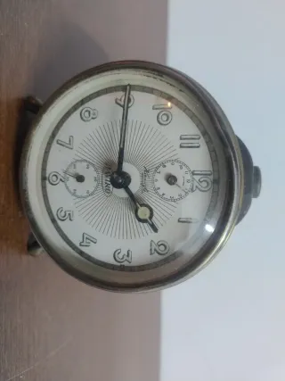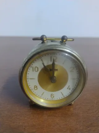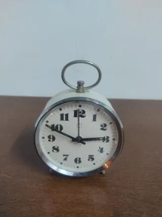 Reloj despertador antiguo con esfera blanca y números arábigos. Presenta dos subesferas. - Mecanismo de cuerda. - Diseño clásico.