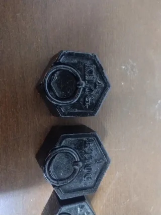 Conjunto de antiguas pesas hexagonales para balanza. - Material: Metal. - Diseño: Hexagonal con asa. - Color: Negro.
