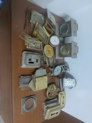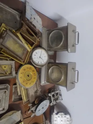 Conjunto de piezas para la reparación o restauración de relojes de carruaje. - Componentes metálicos variados. - Mecanismos y engranajes. - Esferas y manecillas.