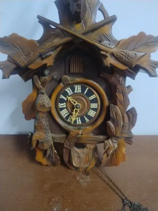 Reloj de cuco antiguo con un diseño detallado. - Elaborado en madera. - Decoración con motivos de caza y naturaleza. - Incluye cadenas para su funcionamiento. - Para restaurar. - Falta péndulo y pesas