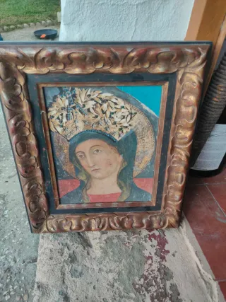Antiguo cuadro religioso con marco dorado. - Representación de la Virgen María. - Marco con detalles ornamentales dorados.