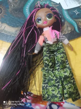 Muñeca L.O.L. Surprise Remix Honeylicious con su característico estilo. - Pelo largo trenzado con mechones rosas. - Ropa de moda con estampado de camuflaje y detalles a cuadros.