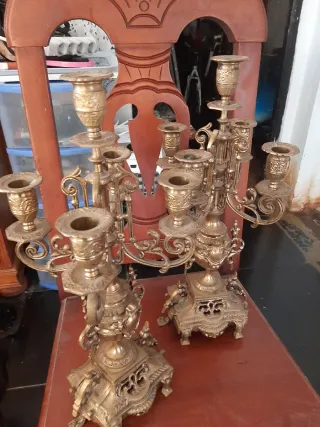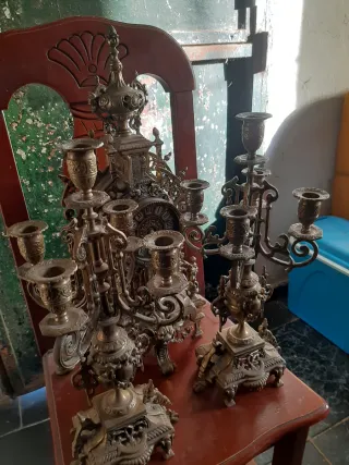 Conjunto de reloj antiguo de sobremesa y candelabros de bronce. - Diseño ornamentado. - Detalles intrincados. - Piezas de colección. Negociable