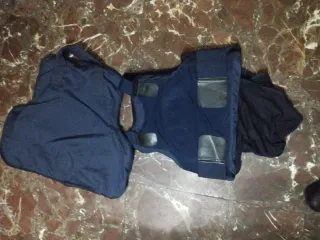 Chaleco antibalas de color azul marino, con funda. No contiene proccion solo placas de poliuretano como relleno lo demás es original - Funda exterior de tela. - Cierre con velcro.
