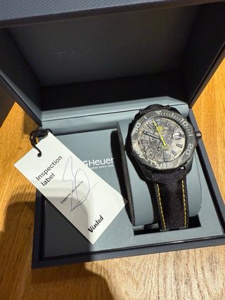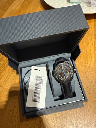 Reloj Tag Heuer Aquaracer con caja de carbono. - Esfera con detalles azules. - Correa de tela negra con costuras azules. - Incluye etiqueta de inspección de Vinted.