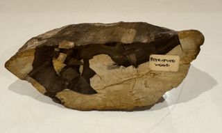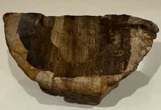 Pieza única de madera petrificada, un fósil natural con una belleza singular. - Muestra patrones y texturas únicas. Peso 332 gr. Largo 11 cm. - Ideal para coleccionistas o como elemento decorativo.