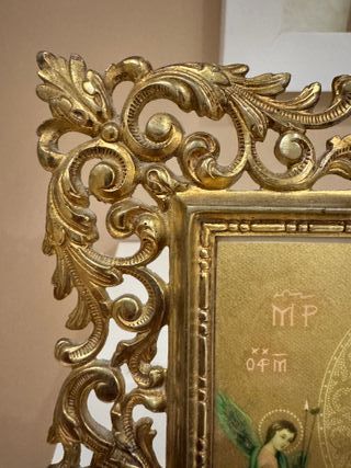 Imagen: Reproducción tipo icono bizantino, con los arcángeles San Miguel y San Gabriel. Marco: Marco ornamental labrado, con un acabado dorado, latón macizo. En excelente estado de conservación, ideal para coleccionistas o decoración religiosa. peso 981 gr. El término "REGISTRADO" grabado en el marco de bronce indica que el diseño de la pieza fue legalmente protegido en su momento. Esto significa que el fabricante registró la propiedad intelectual o una marca específica para ese diseño, asegurándose de que otros no pudieran copiarlo sin permiso.