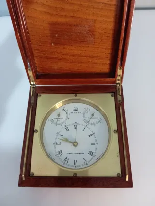 Instrumento de sobremesa RICKMAN con reloj, termómetro e higrómetro. - Caja de madera de caoba. - Esfera blanca con números romanos. - Indicadores de temperatura y humedad. Pilas no incluidas