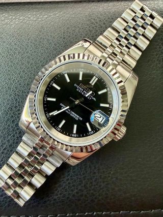 Reloj Seiko modificado con esfera negra estilo Datejust. - Esfera negra. - Bisel estriado. - Correa tipo Jubilee.