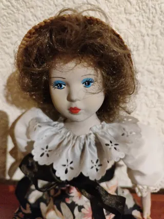 Preciosa muñeca de porcelana con un vestido de época. - Detalles delicados en el rostro y cabello. - Vestido con volantes y encaje. - Sombrero a juego.