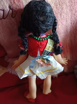 Muñeca antigua de colección, con un estilo que evoca las décadas de los 60 y 70. - Vestido rojo con detalles. - Falda blanca. - Collar de cuentas verdes. - Pañuelo decorativo en la cintura. - Zapatos rojos.