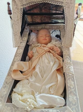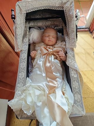 Muñeco reborn de bebé con un precioso vestido. - Vestido blanco satinado con detalles de encaje. - Lazo grande en color champagne. - Incluye diadema. - Aspecto realista.
