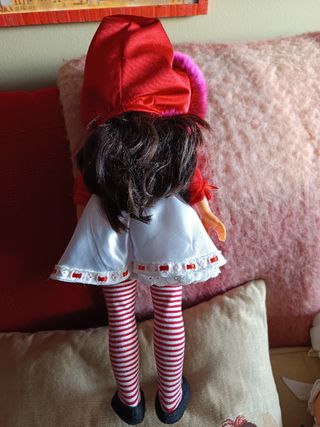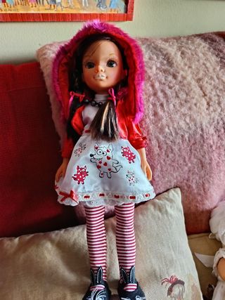 Muñeca con un divertido vestido blanco estampado con lobos rojos y corazones. Lleva una chaqueta roja con capucha de pelo rosa y medias a rayas rojas y blancas. - Vestido con estampado de lobos. - Capucha con pelo sintético. - Medias a rayas.