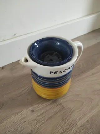 Aceitera antigua con un diseño llamativo. Alto 12cm. Diámetro 10,5 - Inscripción PESCADO en la parte superior. - Cuerpo decorado con rayas azules y naranjas. - Tapa interior azul.