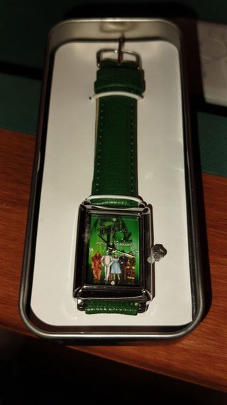 Reloj de pulsera conmemorativo del 70 aniversario de El Mago de Oz. - Correa de cuero verde. - Esfera con diseño de los personajes principales. - Presentado en su estuche metálico. QUEDAN 11 DISPONIBLES