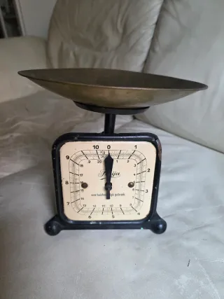 Bascula de cocina antigua de la marca Freija. El texto en holandés, "voor huishoudelijk gebruik", se traduce como "para uso doméstico". Marca: Freija Tipo: Báscula de cocina (pesa hasta 10 kg/20 Pfd) Origen se identifica como una balanza alemana antigua. Se estima que estas básculas de la marca Freija (o 'Fraija') fueron fabricadas aproximadamente en la década de 1930. Suelen identificarse como de fabricación alemana.
