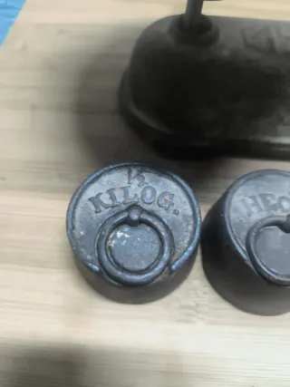 Antigua balanza bascula force5, pesa hasta 5 kilos. Y lote de 3 pesas hexagonales de hierro fundido de: 1 de 200 gramos. 1 de 100 gramos. 1 de 50.gramos. Con base de balanza preciosa. Nivelada. Maravillosamente bien conservada. Con platos de 20cm de diámetro. Muy antigua Bien conservada. Medidas de la base. 40cm de largo. 12cm de ancho. 20m hasta la aguja. Perfecta para decorar. Se puede usar....!!! Preciosa. Muy muy muy bonita. Precio: 45,00€...;!!!!! Se realizan envíos.