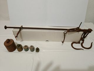 Báscula romana antigua con 5 pesas