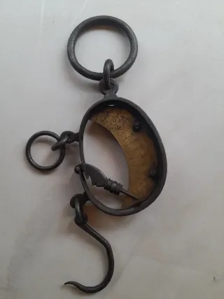 Báscula antigua de hierro con mecanismo de muelle. Presenta un diseño robusto y detalles grabados. -Romana de gancho - Fabricada en hierro. - Mecanismo de muelle. - Grabados decorativos y de medición.