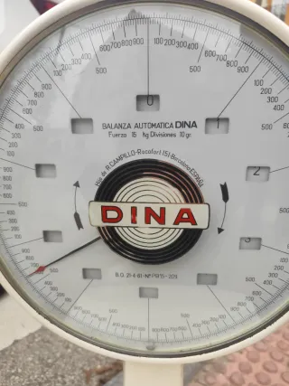 Báscula colgante de la marca DINA, un modelo antiguo con un diseño clásico. - Esfera redonda con dial. - Plato metálico. - Soporte para colgar.