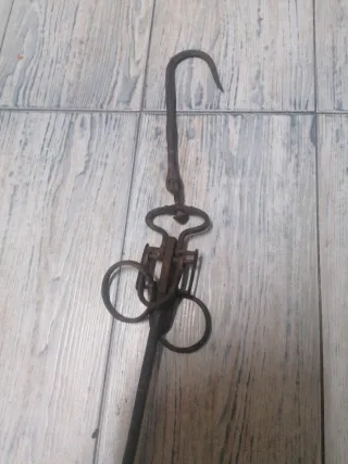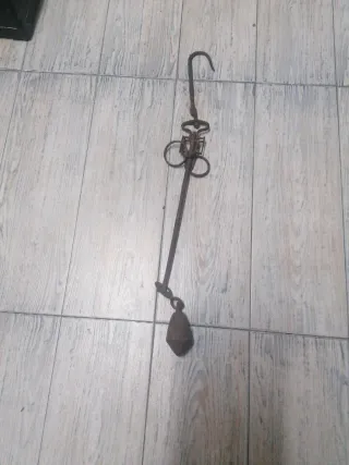Báscula balanza antigua Romana, procedencia mallorquina con tres ganchos y pilón de peso incorporado. Señales de uso por el paso del tiempo.