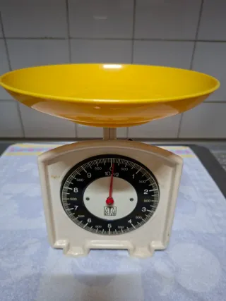 Báscula de cocina antigua con un diseño clásico y un cuenco amarillo. - Capacidad máxima de 10 kg. - Esfera con marcas en kilogramos y gramos.
