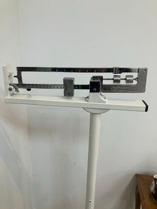 Báscula de peso antigua de uso médico, con un diseño clásico y robusto. Incluye un altímetro integrado para mediciones completas. - Estructura metálica. - Altímetro con escala visible.