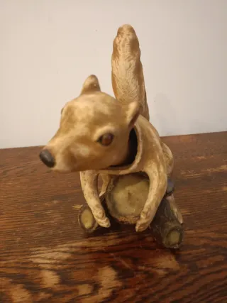 Figura antigua de ardilla con cabeza basculante. - Diseño detallado de ardilla. - Base de tronco para soporte.