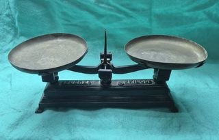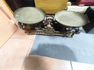 Báscula de platos antigua, ideal para coleccionistas o decoración. - Fabricada en metal. - Diseño clásico con dos platos. - Base ornamentada.