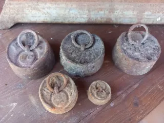 Conjunto de pesas hexagonales de hierro fundido, ideales para básculas antiguas. - Peso principal de 2 kg. - Incluye pesa de 1 kg. - Pesa de 1/2 kg. - Pesa de 1/4 kg. - Diseño clásico con anilla para colgar.