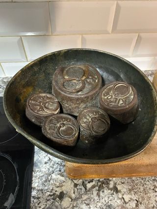 Balanza antigua procedente de Francia. Le faltan 3 pesas pequeñas.
