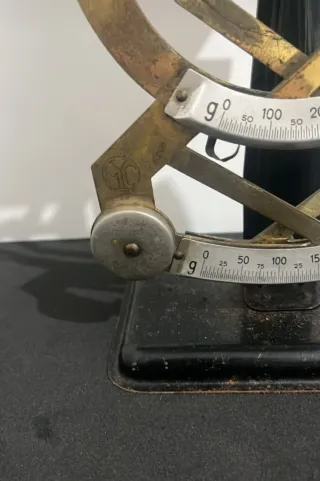 Báscula antigua de cartas, ideal para coleccionistas o decoración. - Diseño metálico con detalles en latón. - Plato superior para colocar objetos. - Escala graduada visible.