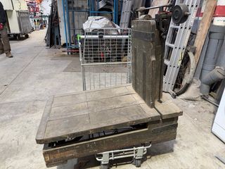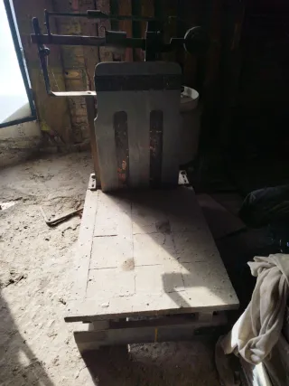 Báscula antigua con base de madera y estructura metálica. - Plataforma de madera con listones. - Mecanismo de pesaje visible. - Detalles metálicos