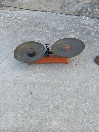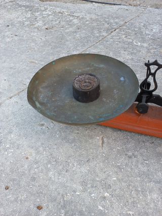 Báscula antigua, el soporte 5kg. tiene dos pesas de 1kg y de medio kg. tiene bastantes años, es antigua