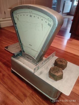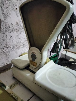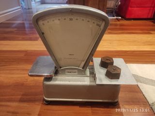 Báscula antigua de la marca Testut, funciona perfectamente (pesa bien). Se regalan las dos pesas. No se hacen envíos, venir a recoger.