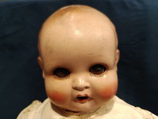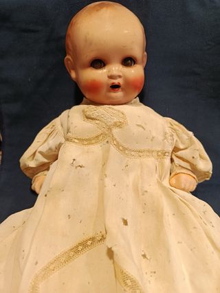 Bonito muñeco alemán, marcado en la nuca Germany MAGO 492. 5/0 En perfecto estado, ojos marrones basculantes hacia los lados. Ropa original, varios faldones, el exterior muestra agujeritos.